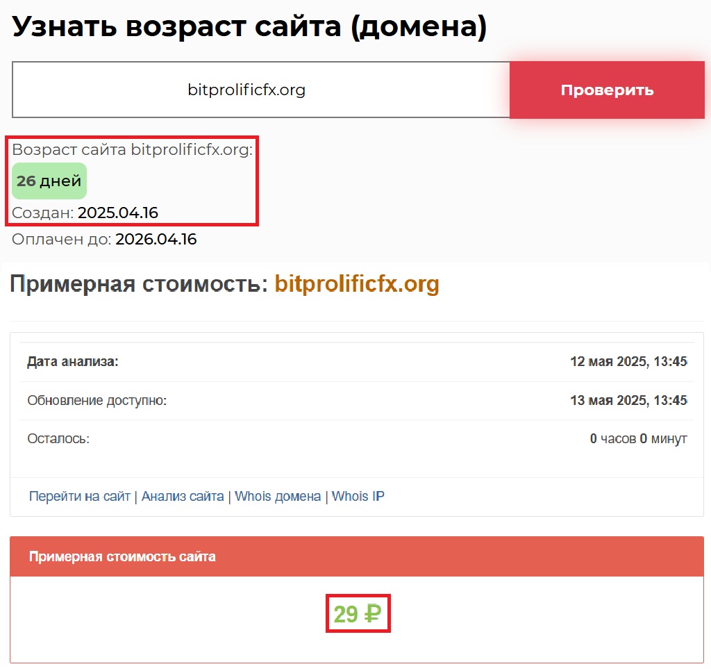 Сайт bitprolificfx.org не производит никакого впечатления серьезного ресурса. Какой бы фантазией ни обладали его создатели, изменить сам факт они не в силах — домен был зарегистрирован 16 апреля 2025 года. Сами понимаете, речь идет даже не о месяце. Какой тут может быть опыт? Как можно заявлять о десятилетиях успешной деятельности, если сайт работает меньше пары лет? Это уже даже не преувеличение — это просто ложь. Причем примитивная.