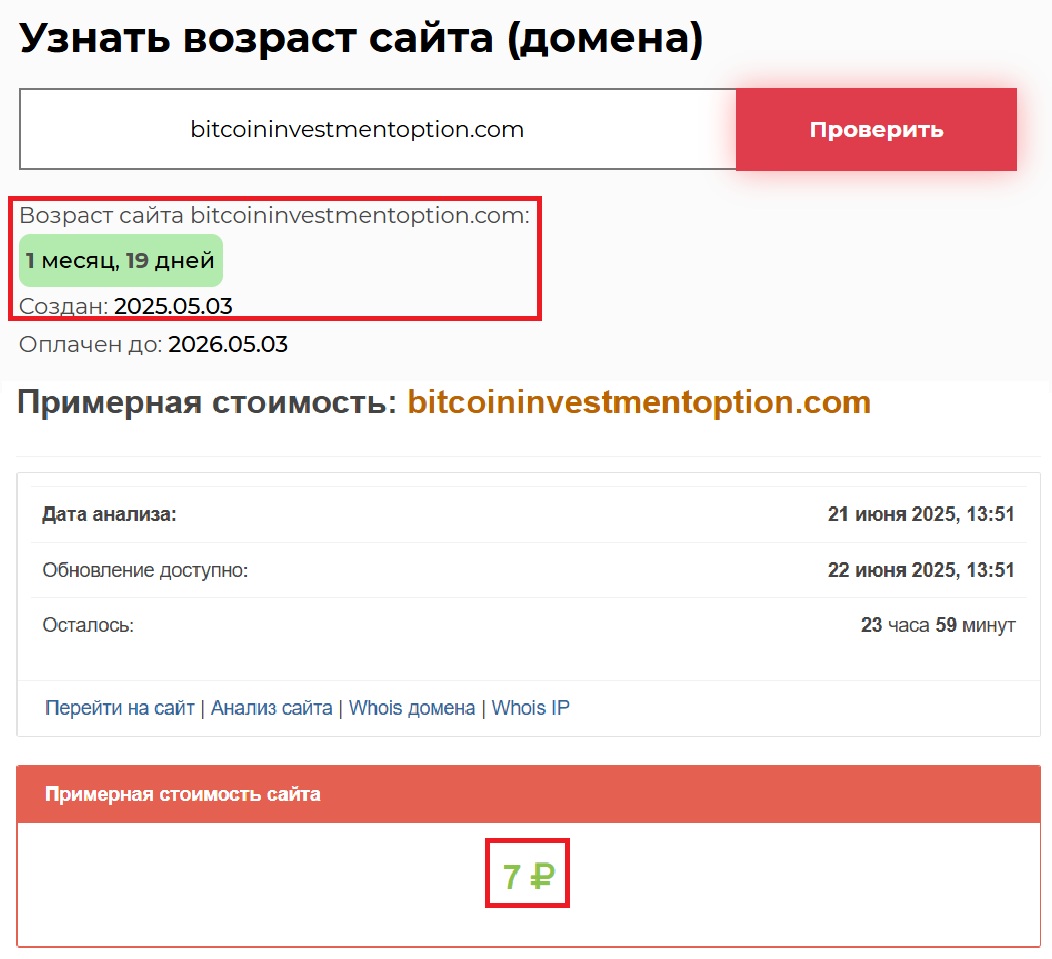 Сервисы анализа, такие как Seolik и Whois, показали интересную деталь. Домен зарегистрирован 3 мая 2025 года. То есть проекту чуть больше месяца! Разве за такой срок можно успеть доказать свою надежность? Тем более — в столь сложной и чувствительной сфере, как инвестиции? Вряд ли. Более того, домен, как выяснилось, стоил… 7 рублей. Ниже некуда, прямо скажем. Как вы думаете, кто-то станет строить серьезную компанию на такой основе?