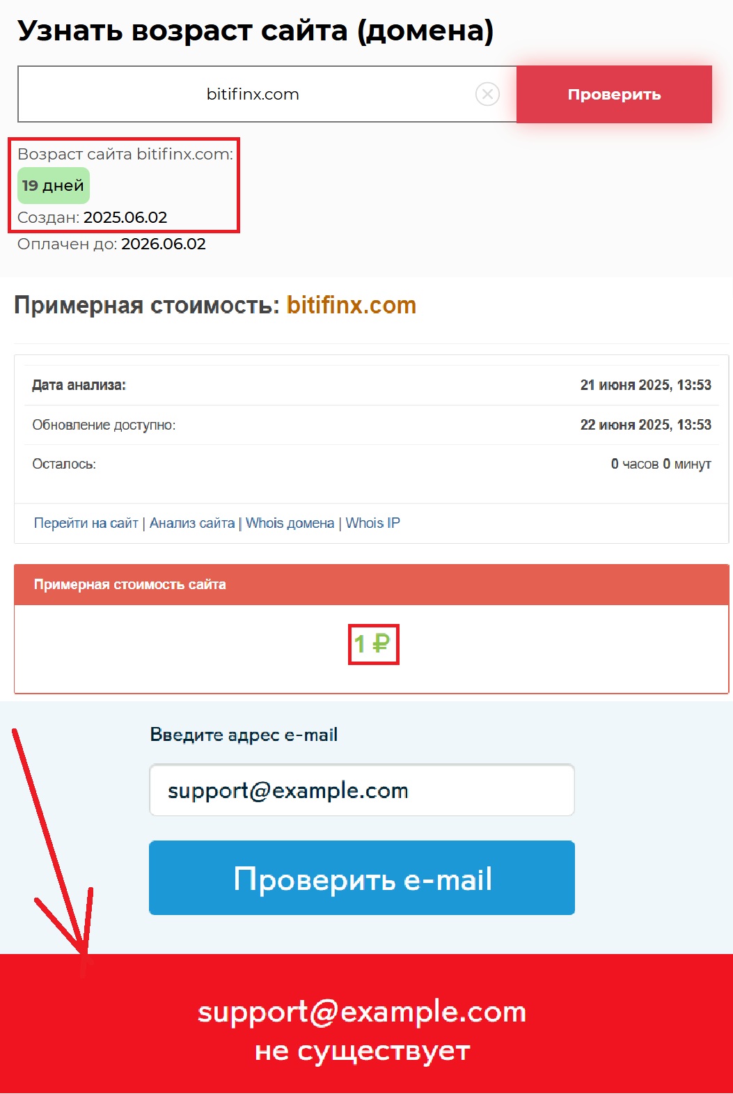 А теперь о главном. Домен bitifinx.com, как выяснилось, был зарегистрирован не в 2007 году, как пытаются внушить создатели сайта. Все иначе. Мошенники попросту врут о своем опыте, поскольку реальная деятельность началась 19 дней назад, то есть 2 июня 2025 года. После этого началась активная «раскрутка» в телеграм-каналах, мессенджерах и даже на теневых форумах. Вывод напрашивается сам собой: все, что мы видим — фейковый проект, выстроенный на обмане с самого основания.