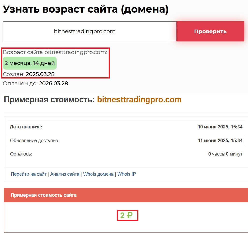 Любопытный момент. Если воспользоваться открытыми источниками, например сервисом Whois, становится ясно — данная компания появилась буквально вчера. Регистрация домена зафиксирована 28 марта 2025 года. Как вы понимаете, говорить о каком-либо «опыте», который столь настойчиво упоминается на сайте, попросту не приходится. Более того, стоимость домена — два рубля. О каких серьезных инвестициях в развитие бизнеса можно тут вообще говорить?