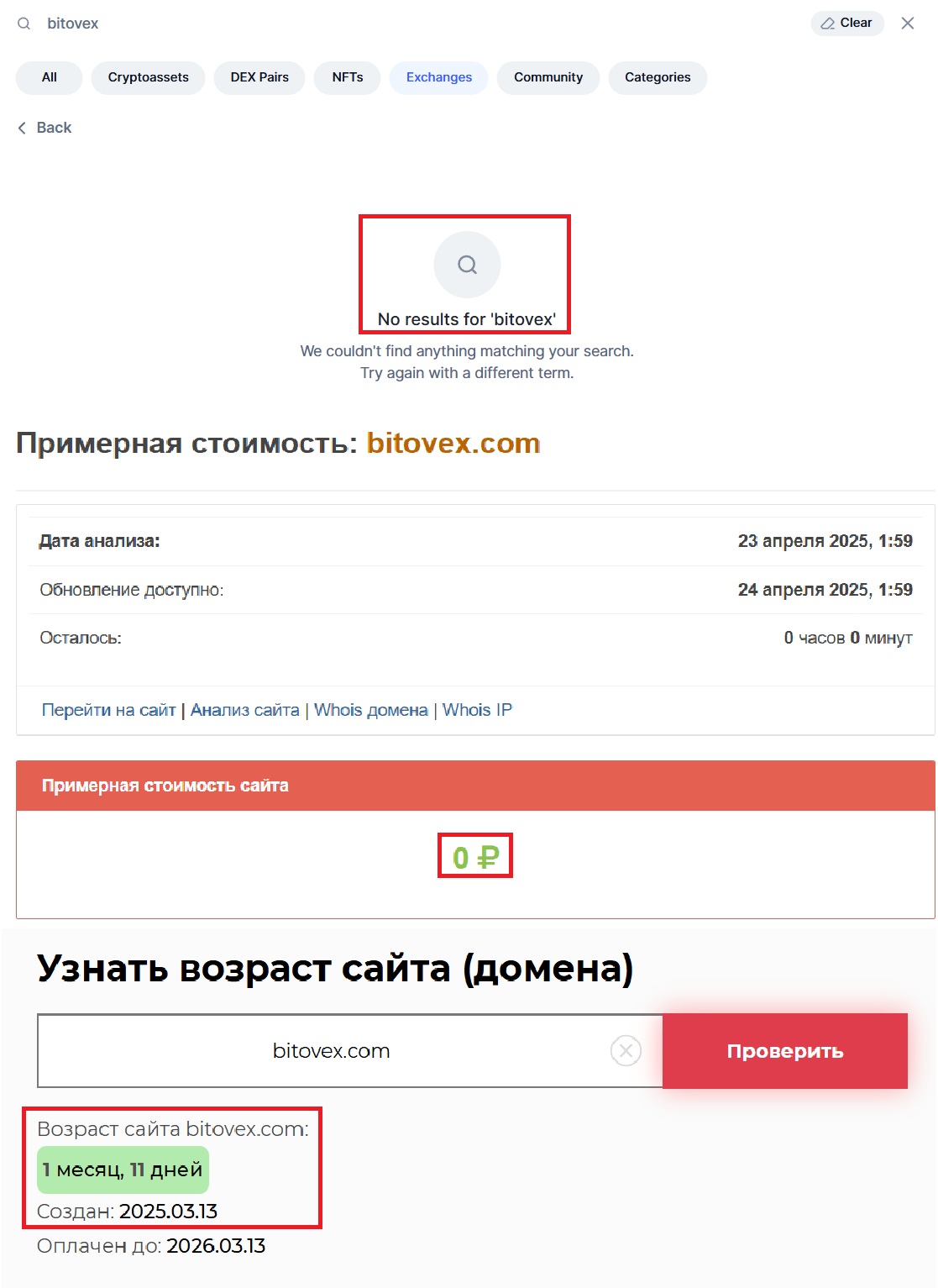 - низкую примерную стоимость сайта (оценка в 0 рублей говорит о том, что аферистами было использовано максимально банальное и дешевое оформление, которое часто выбирают и другие обманщики с целью экономии собственных вложений);