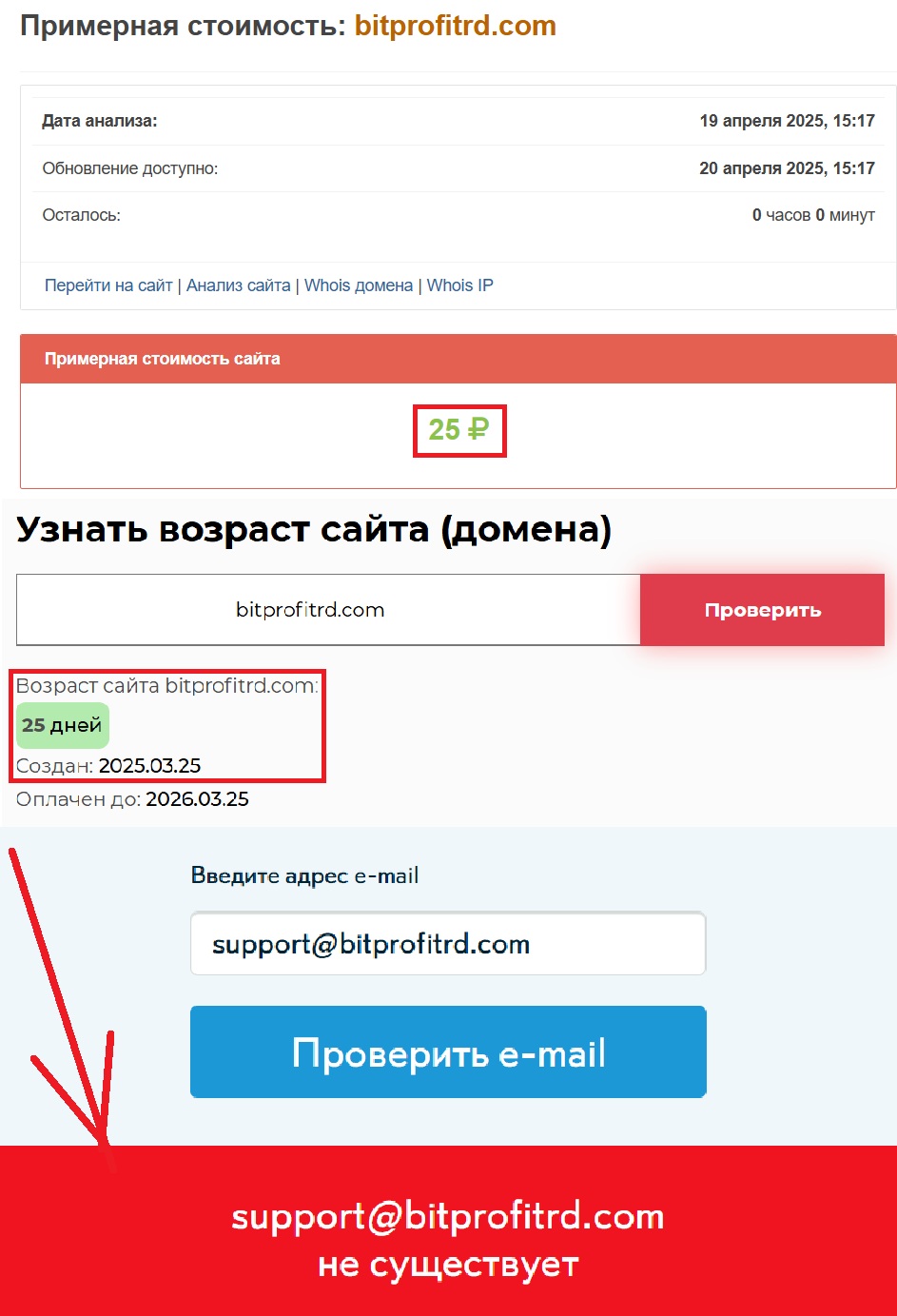 Кстати, насчет законности. Мы провели проверку через ряд открытых источников и установили следующее: Bitprofitrdis начал свою активность только 25 марта 2025 года. То есть, на момент написания этого текста проекту едва ли исполнился месяц. Разве можно за такой короткий срок построить доверие с клиентами? Сомневаемся. Более того, стоимость самого домена — всего 25 рублей. Это даже не символично, это откровенно тревожно. Что может стоить такую сумму в сфере финансовых услуг? Наверное, только пустые обещания.