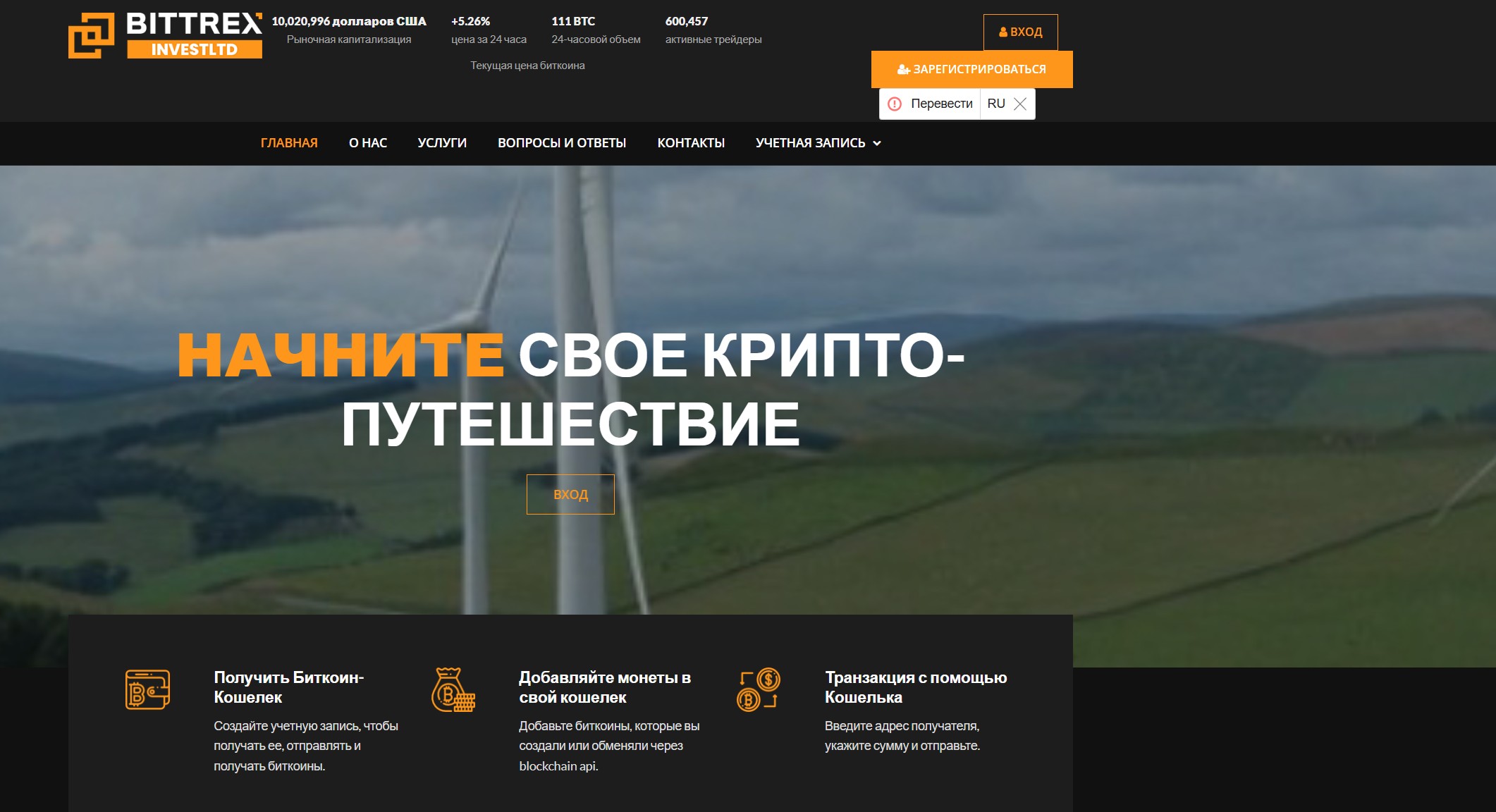 Сама страница — bittrexinvestltd.com — это не продукт разработчиков или команды профессионалов. Это обычный шаблон. Знаете, такой, что можно скачать бесплатно, чуть покрасить в другой цвет, вставить новое название — и вперед. Публикуй ссылки в соцсетях, заливай фальшивые отзывы, создавай видимость кипящей деятельности. Именно так Bittrex и работает. По факту — все сводится к агрессивному продвижению через фейковые аккаунты. Заманивают новичков, сулят золотые горы, убеждают начать «зарабатывать».