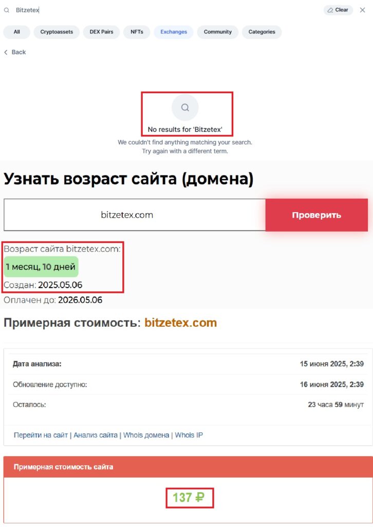 Начнем анализ сервиса с изучения общих сведений. В ходе проверки сайта Bitzetex было установлено, что его зарегистрировали примерно месяц назад. Что в этом такого? Любая уважающая себя криптобиржа имеет за плечами годы репутации, лицензии, историю, прозрачность. А в случае с героями нашего сегодняшнего обзора видим лишь пустоту.