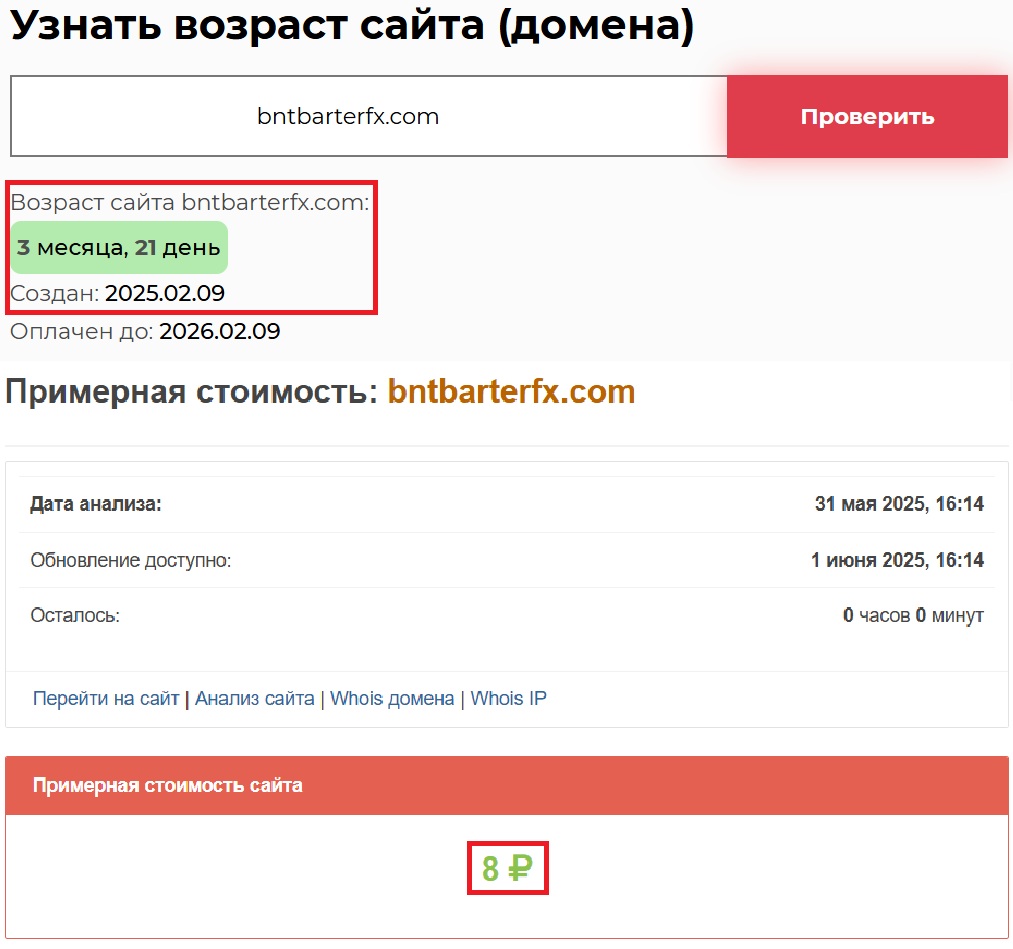 Мы проверили регистрацию домена. Все как обычно. Сайт был создан 3 месяца и 21 день назад, то есть 9 февраля 2025 года, что ничтожно мало для нормальной компании. Это все, что вам нужно знать о «многолетнем опыте». Да и вообще, кто серьезный начнет инвестиционный проект со лжи? И знаете, что еще показательно? Стоимость сайта. Ровно восемь рублей. Мы даже дважды пересмотрели эту информацию — не показалось ли? Нет, не показалось. Проект, который обещает вам финансовую стабильность и рост капитала, сам по себе стоит дешевле чашки дешевого кофе. Тут даже иронизировать не хочется. Это просто грустно.