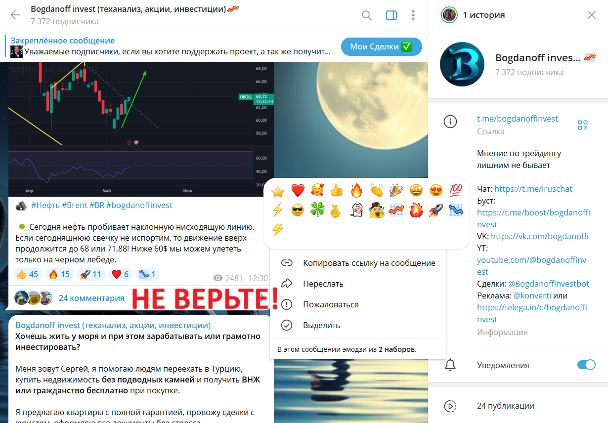 Подозрительным кажется также тот факт, что в ленте канала есть много рекламы сторонних ресурсов. Данный аспект может указывать на отсутствие в мошенника желаемого уровня прибыли через трейдинг из-за чего ему приходится искать дополнительные источники дохода.