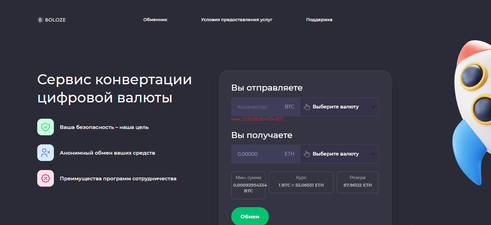 Недобросовестной деятельностью занимаются в фальшивом обменнике Boloze. Можно сказать, что платформа выглядит весьма прилично. Однако таковым является лишь первое впечатление. Если же более детально проанализировать проект, то удастся выявить в нем немало подозрительных моментов.