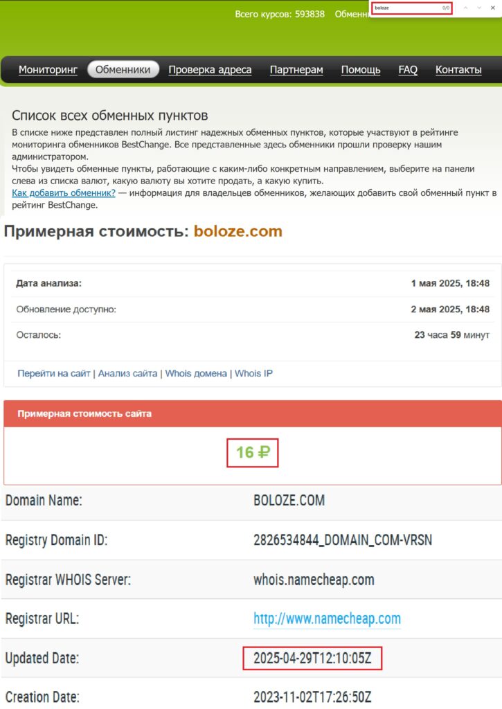 Анализ домена Boloze показывает, что он был создан в 2023 году, но только в 2025 начал работать. Примерная стоимость пространства была оценена в 16 рублей, что считается малым показателем как для якобы надежной и серьезной организации.