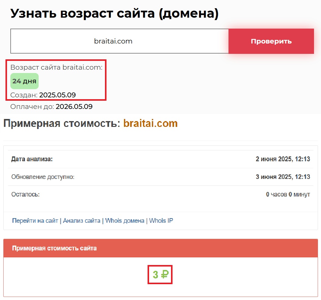 Кстати, есть еще один интересный момент, на который стоит обратить внимание. Сайт существует с 9 мая 2025 года, всего 24 дня. А значит, никакой опыт, никакая репутация и, уж точно, никакая история за этим проектом не стоят. Все — от и до — липа. Цена домена в три рубля лишь подтверждает наши опасения. Мы уже видели сотни подобных проектов. И, поверьте, ни один из них не завершился чем-то хорошим для инвесторов. Так что подумайте дважды.