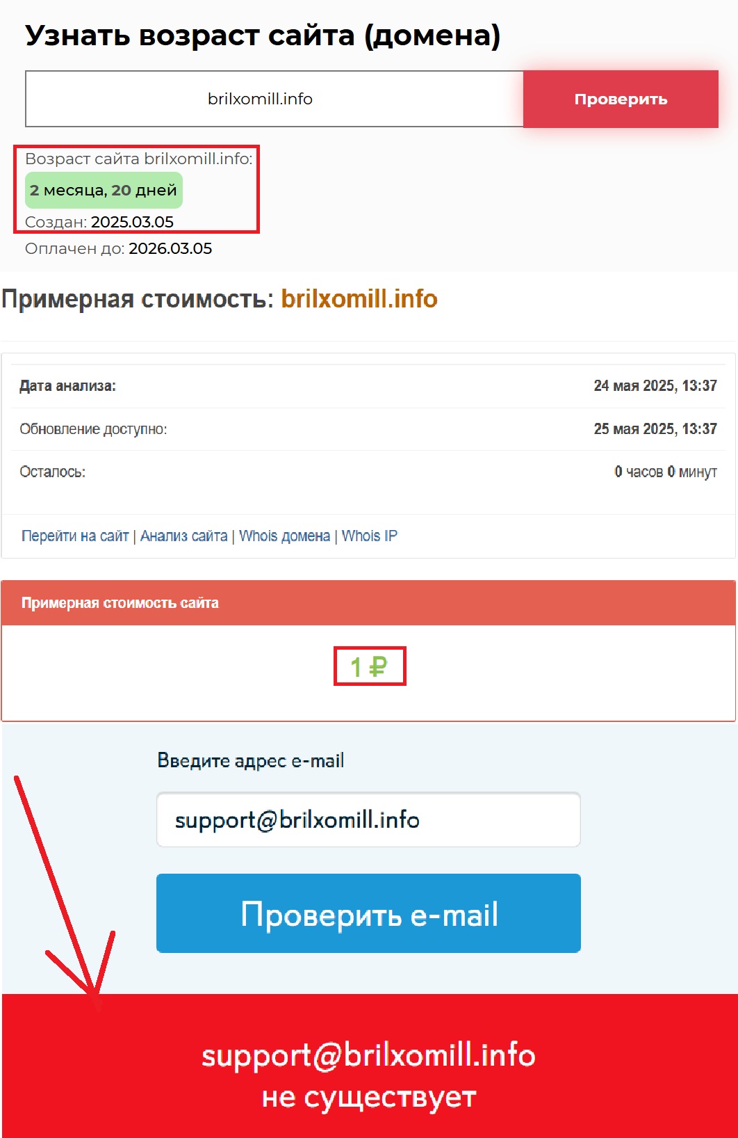 Теперь — немного цифр. И они, как это ни странно, тоже играют против Brilxomill. Сайт зарегистрирован 2 месяца и 20 дней назад, то есть 5 марта 2025 года. Согласитесь, это явно не срок работы серьезного проекта. И, что особенно забавно, домен куплен за символическую сумму — ровно один рубль. Вы бы стали доверять свои деньги компании, для которой даже имя в интернете стоит меньше чашки кофе?