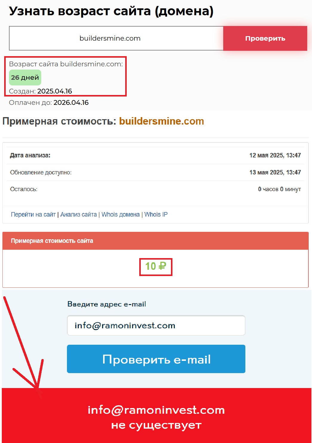 А теперь давайте вернемся к «торговому терминалу», который они так расхваливают. Все, что там происходит, контролируется специальным программным обеспечением. И что это значит? Все просто: курс пойдет не туда, куда вы спрогнозировали, а туда, куда нужно им. Сделка может быть в плюсе — а в следующую секунду уже в минусе. И попробуйте потом доказать, что вас обманули. Спойлер: не получится. Потому что у Builders Mine нет ни офиса, ни команды, ни даже нормального способа связи. Да, серьезно. Даже элементарная почта info@ramoninvest.com полностью фальшивая.