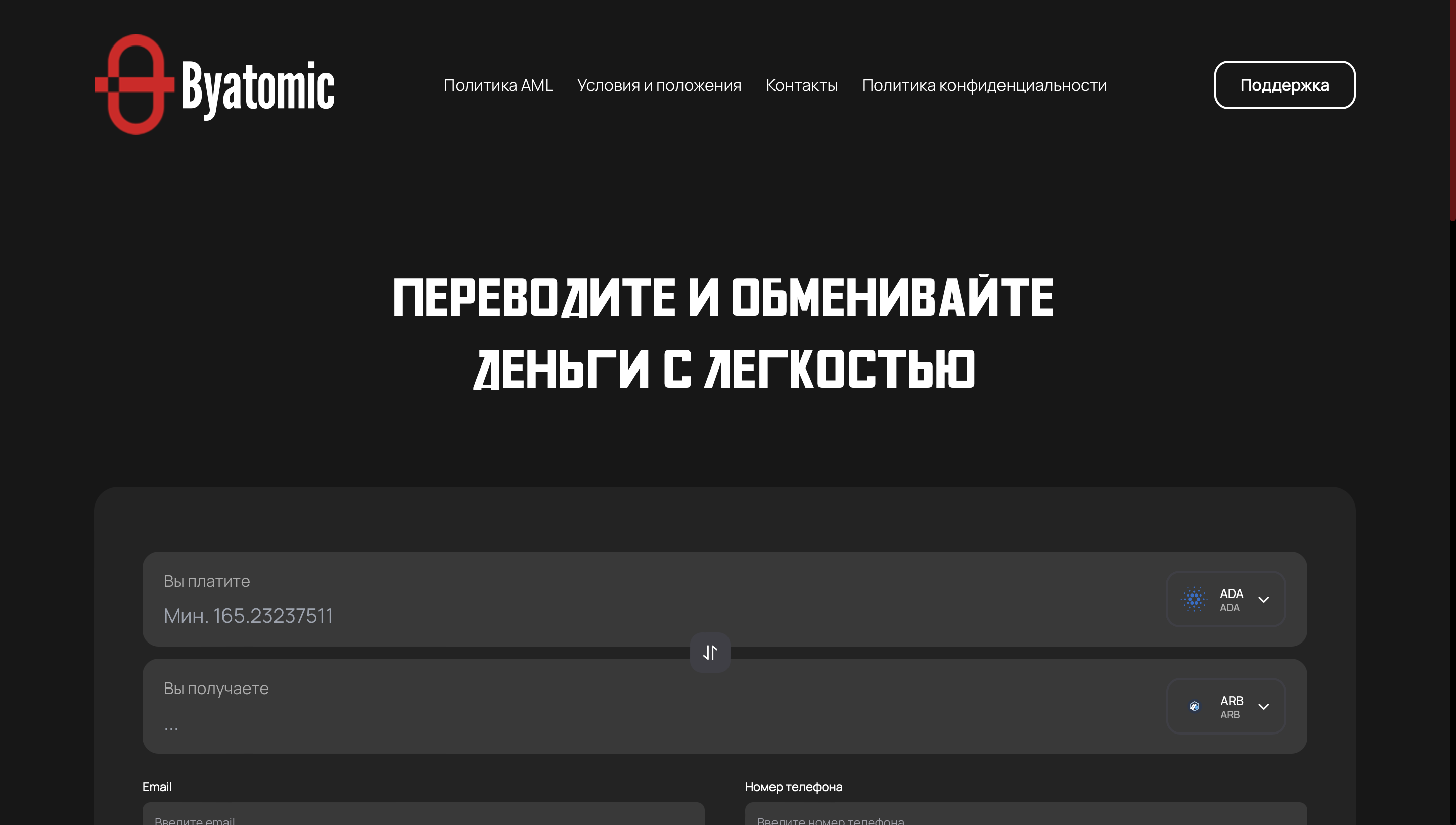 Примером недобросовестного проекта, в котором могут лишь нагло кинуть на деньги, выступает Byatomic. Это якобы надежный обменник криптовалют. Его создатели гарантируют потенциальным клиентам надежность, безопасность, скорость и прочие преимущества. Но в действительности юзеры, начавшие работать с конторой, ничего из этого не получают.