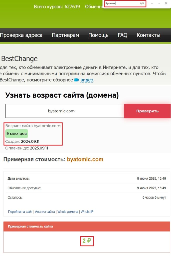 В ходе проверки платформы было выявлено, что негативная репутация является не единственным показателем мошенничества. Сайт Byatomic оценен всего в 2 рубля, что говорит о банальности и дешевизне выбранного злоумышленниками дизайна. Отметим тот факт, что подобная экономия присуща исключительно шарлатанам, понимающим, что нет смысла вкладывать больше в лохотроны.
