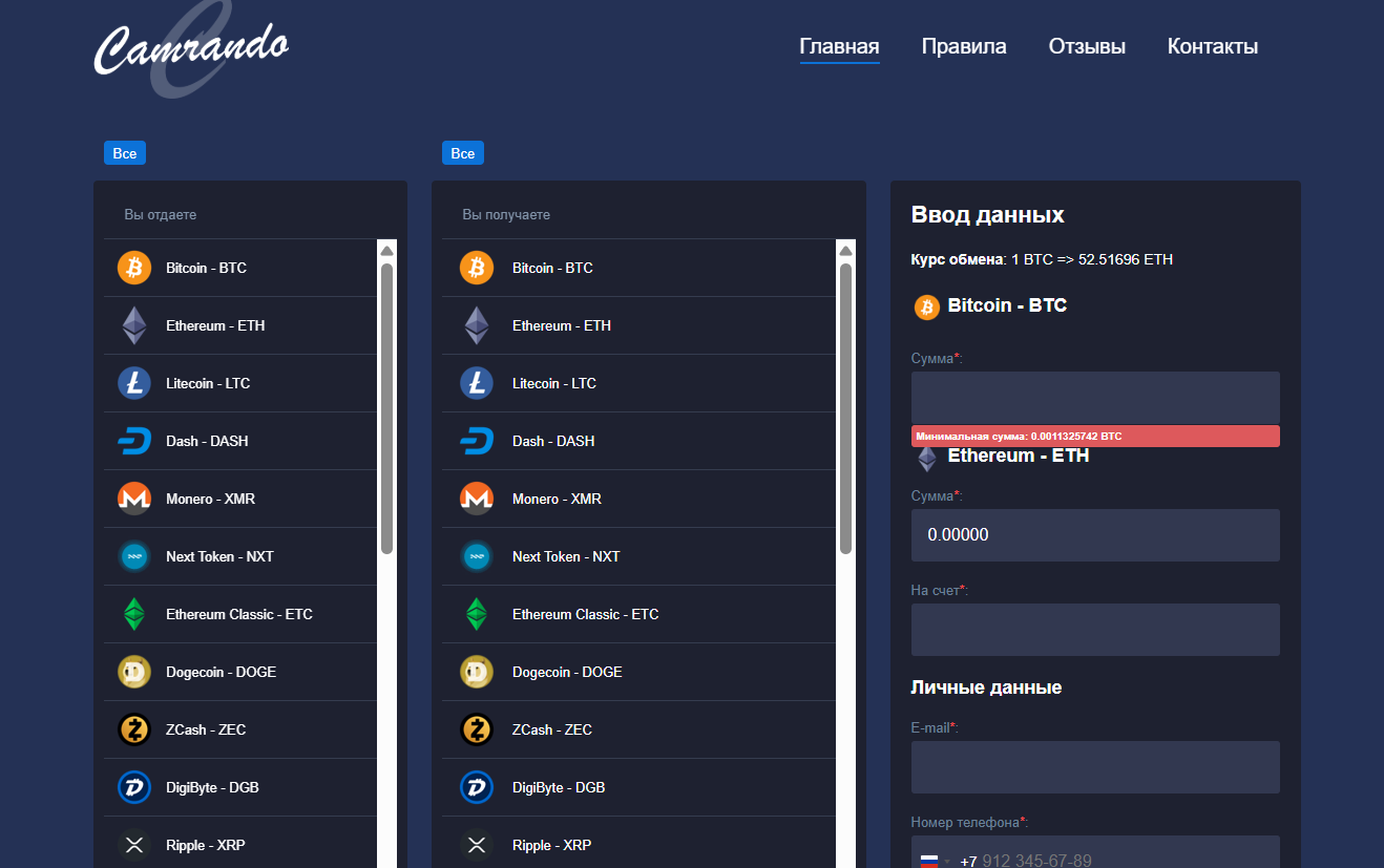 Camrando является очередным фальшивым обменником крипты, а не надежным проектом с множеством функций, как о том было заявлено на сайте конторы и в ее рекламе. Жулики, стоящие за данной платформой постарались над созданием красивой обертки. Но вложить полезное содержание в свое творение они забыли (или же просто не захотели).