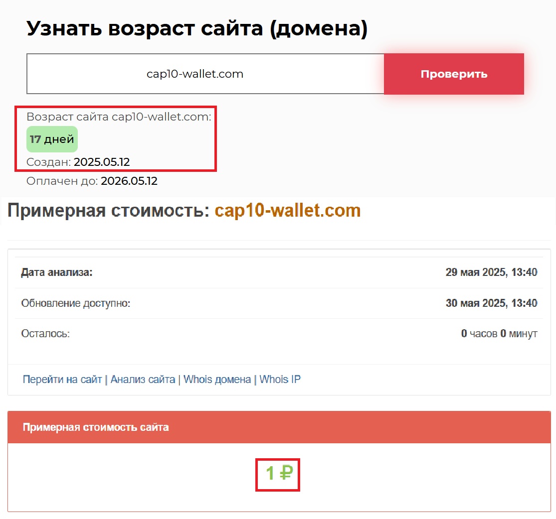 Мы долго разбирались, что именно не так с этим сайтом, и в какой-то момент стало ясно — все. Абсолютно все построено на обмане. cap10-wallet.com пытается казаться финансовым гигантом, обещающим стабильную доходность и «прозрачную аналитику». Но стоит копнуть чуть глубже, и вся конструкция разваливается. Первое, что бросается в глаза — это даты. По информации Whois, проект запущен всего несколько недель назад — 12 мая 2025 года. Как это соотносится с их заявлениями о многолетнем опыте? Никак.
