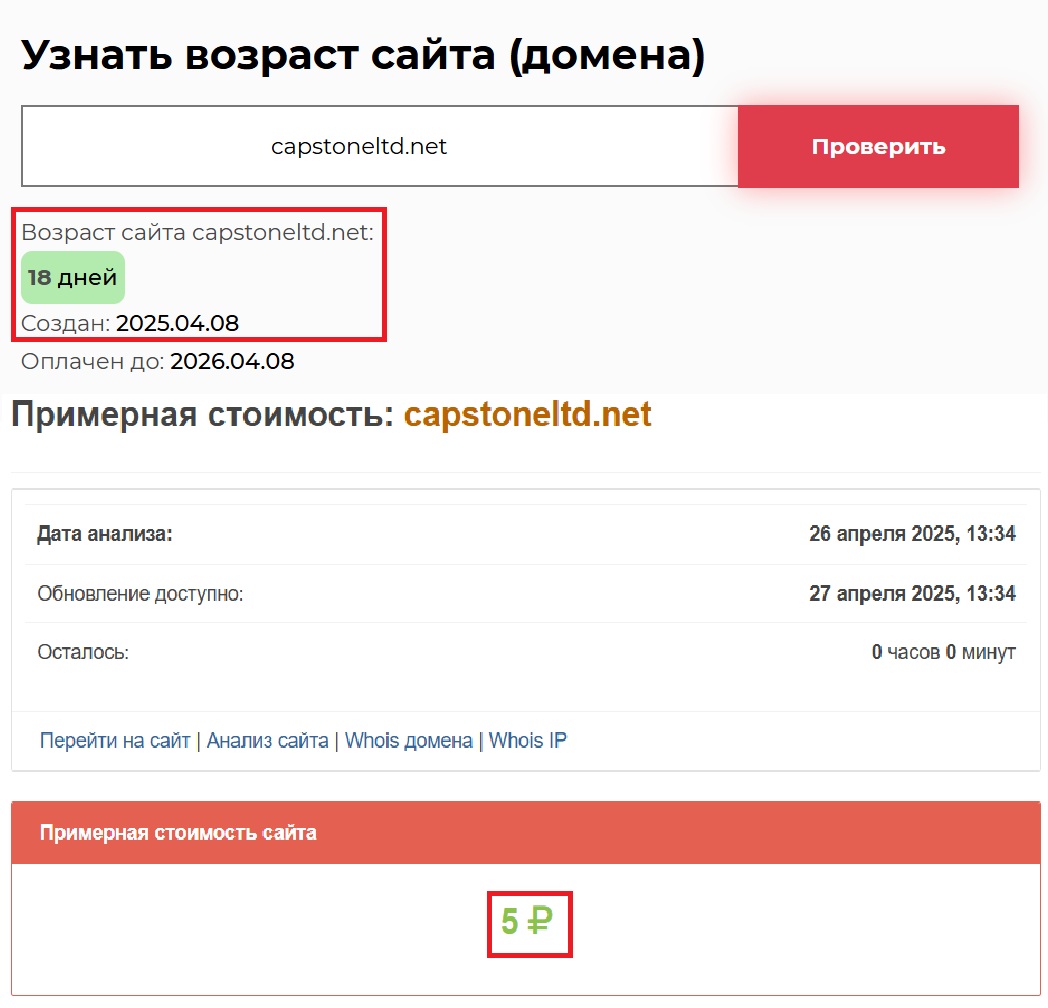 Мы решили проверить проект через сторонние сервисы, чтобы окончательно разобраться, что к чему. Оказалось, что домен действительно существует с 8 апреля 2025 года. Это означает только одно: мошенники рассказывают сказки о многолетнем опыте, чтобы создать иллюзию легальности и внушить доверие тем, кто не будет копать глубже.