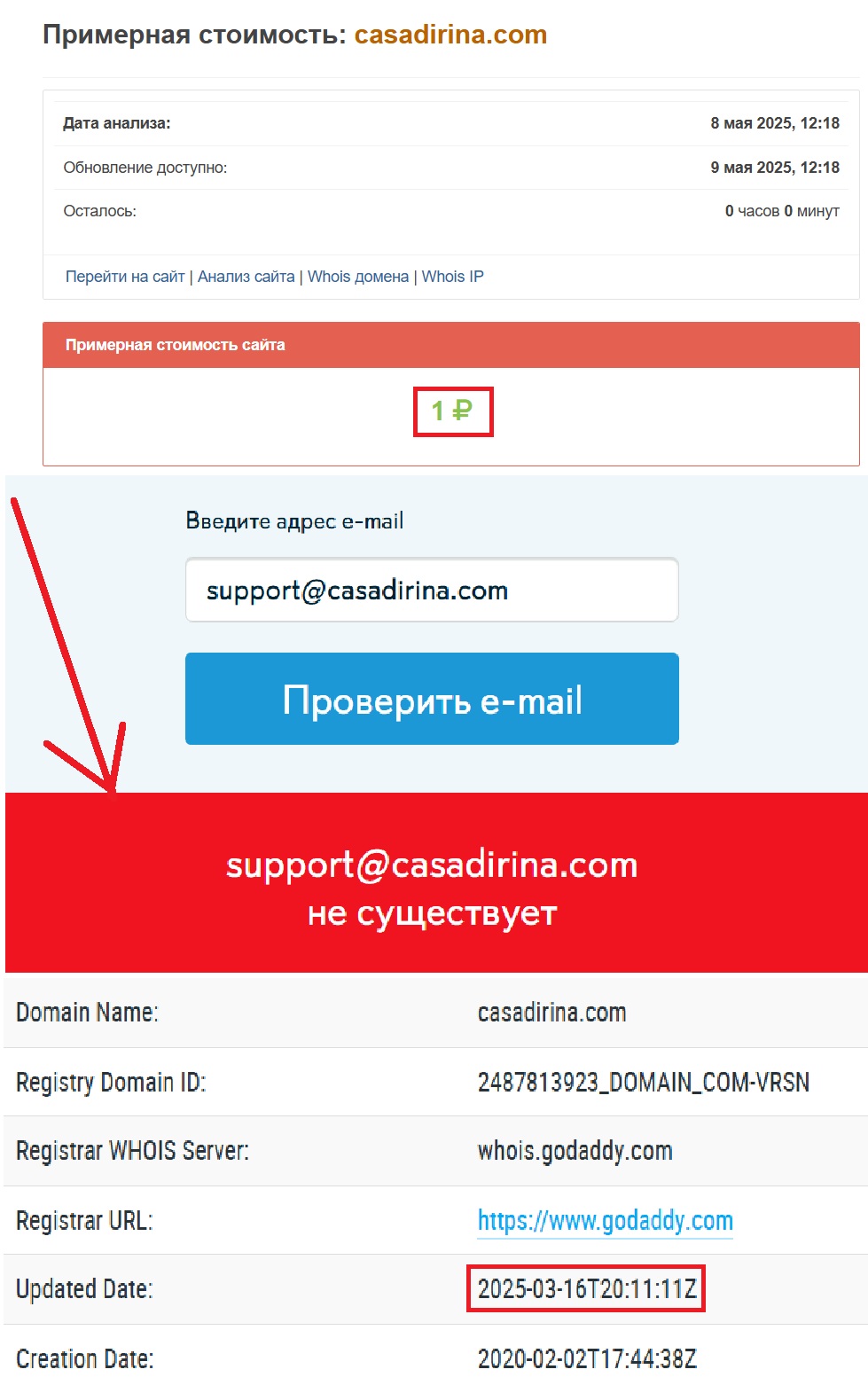 Контактов, как вы уже догадались — ноль. Ну, то есть на бумаге все красиво. Но попробуйте реально связаться — и быстро поймете, что никого там нет. Ни службы поддержки, ни вменяемого менеджера. Даже банальная электронная почта support@casadirina.com и та оказалась поддельной. Да и что вы хотели за… один рубль? Именно столько стоит этот домен. Серьезный бизнес не строится на копейках, а вот мошенничество — вполне.