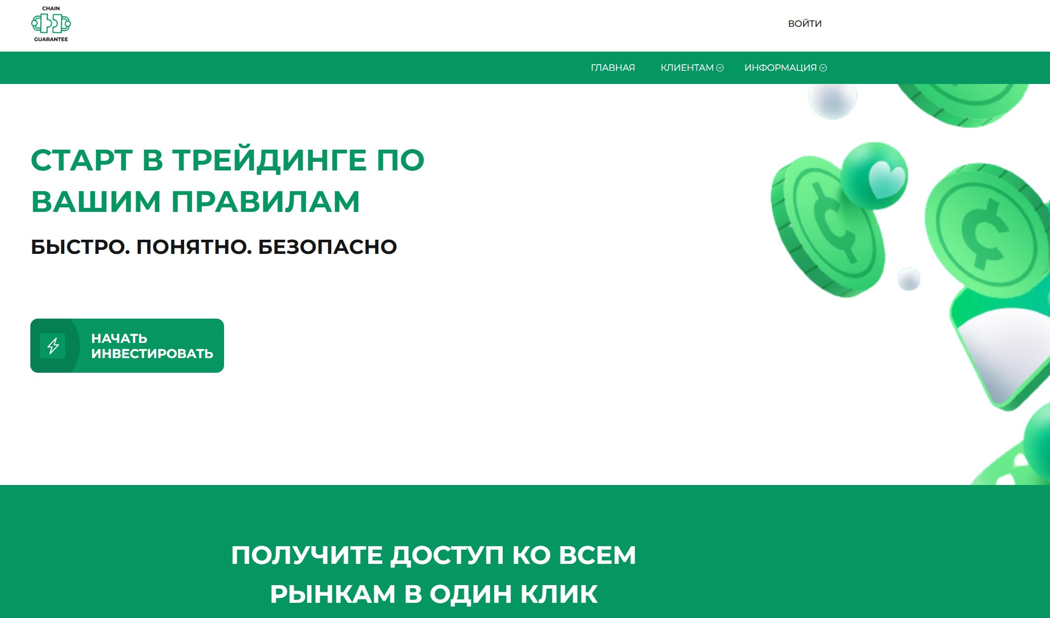 Представьте себе: вы заходите на сайт, который уверяет — вот она, настоящая находка! Не просто очередная платформа для инвестиций, а якобы гигант мирового рынка. Звучит убедительно, правда? Вам говорят, что все предельно просто — регистрируетесь, вносите средства, и дальше работает команда профессионалов. Торгуют, управляют вашим вкладом, а вы просто ждете прибыли. На деле за всем этим стоит сомнительный проект Chain Guarantee, который, по сути, не имеет даже малейшего права работать с чужими финансами.