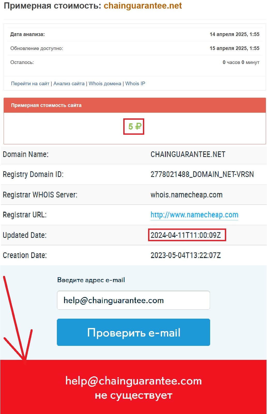 Добавим сюда еще один интересный факт — домен начал использоваться только с 11 апреля 2024 года. То есть проект сырой, и за такой короткий срок просто невозможно создать надежную платформу. А тут — пожалуйста, обещают горы золота с первой же недели. Кстати, стоимость этого гиганта как оказалось, ничтожно мала — всего-то пять рублей. Контакты, которые указаны на сайте — это вообще отдельная история. Номер телефона +44 7570 409 154 неактивен, адрес Ключевая ул., 30, Санкт-Петербург, Россия, 195221 — скорее всего, выдуман, а электронная почта help@chainguarantee.com не отвечает.
