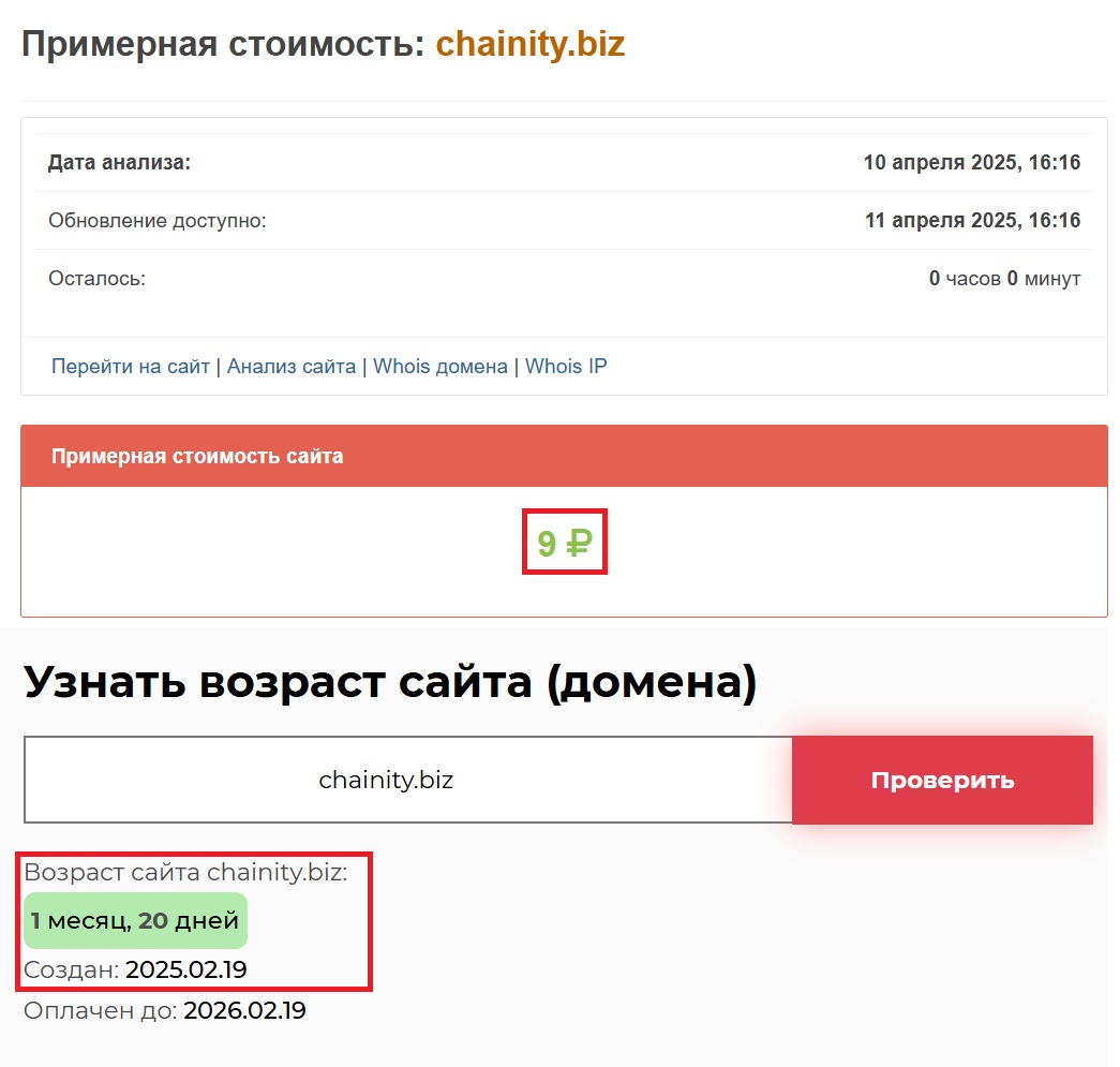 Вы можете сами взглянуть на chainity.biz. Он не вызывает никакого доверия — визуально слабый, наполнения почти нет. Мы проверили возраст домена — 1 месяц и 20 дней. Что это нам говорит? Очень просто: перед нами не зрелый проект, а очередная наспех сделанная афера. Причем стоимость самого сайта — всего девять рублей. Это не ошибка. Именно столько. Неужели вы действительно думаете, что надежный брокер станет экономить на своем собственном сайте?