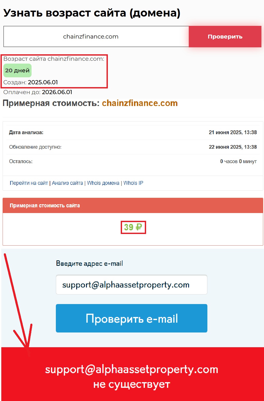 И вот еще важная деталь. Согласно технической информации, стоимость сайта Chainz Finance составляет… 39 рублей. Это даже не метафора. За такую сумму вряд ли можно ожидать чего-то серьезного. Это показатель. Да и что говорить о сервисе, если контора предоставляет только фейковую почту support@chainzfinance.com.
