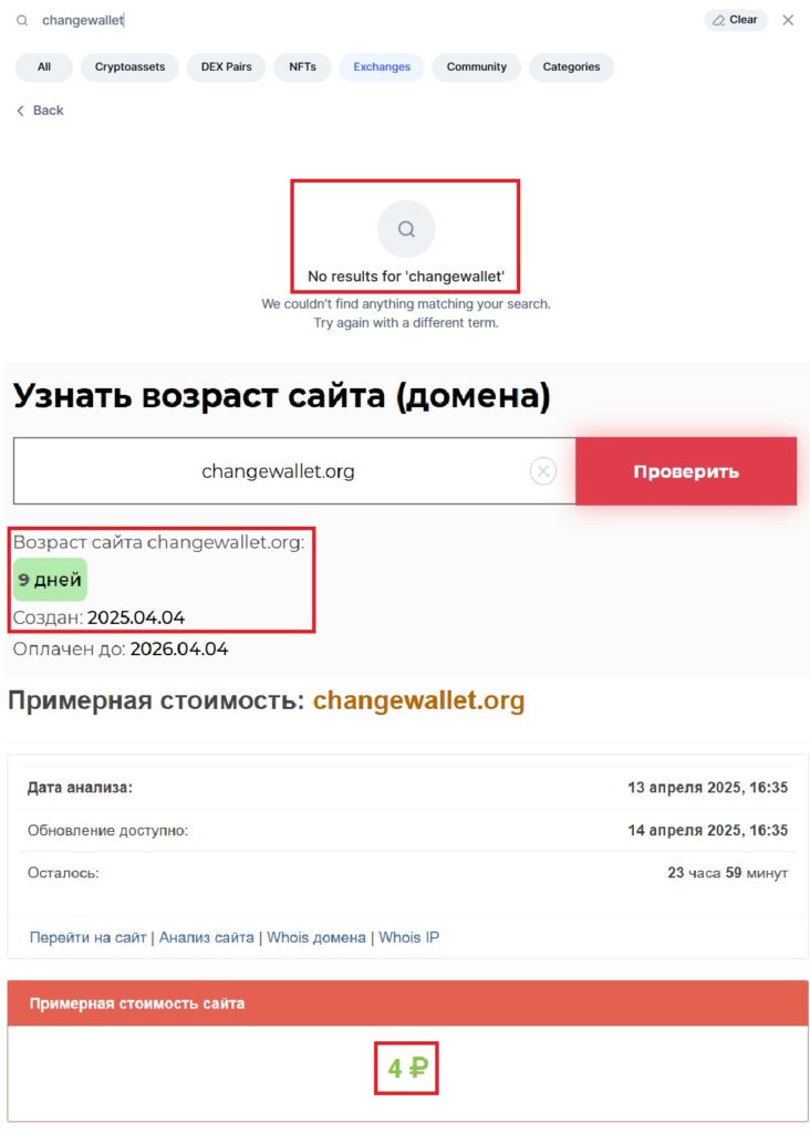 Дальше предлагаем обратить внимание на малый возраст домена: сайт был создан менее 2 недель назад. Зная об этом, можно поразмыслить о следующем: о какой надежности, серьезности и качестве идет речь на Changewallet? Нормальные биржи годами нарабатывают себе репутацию.