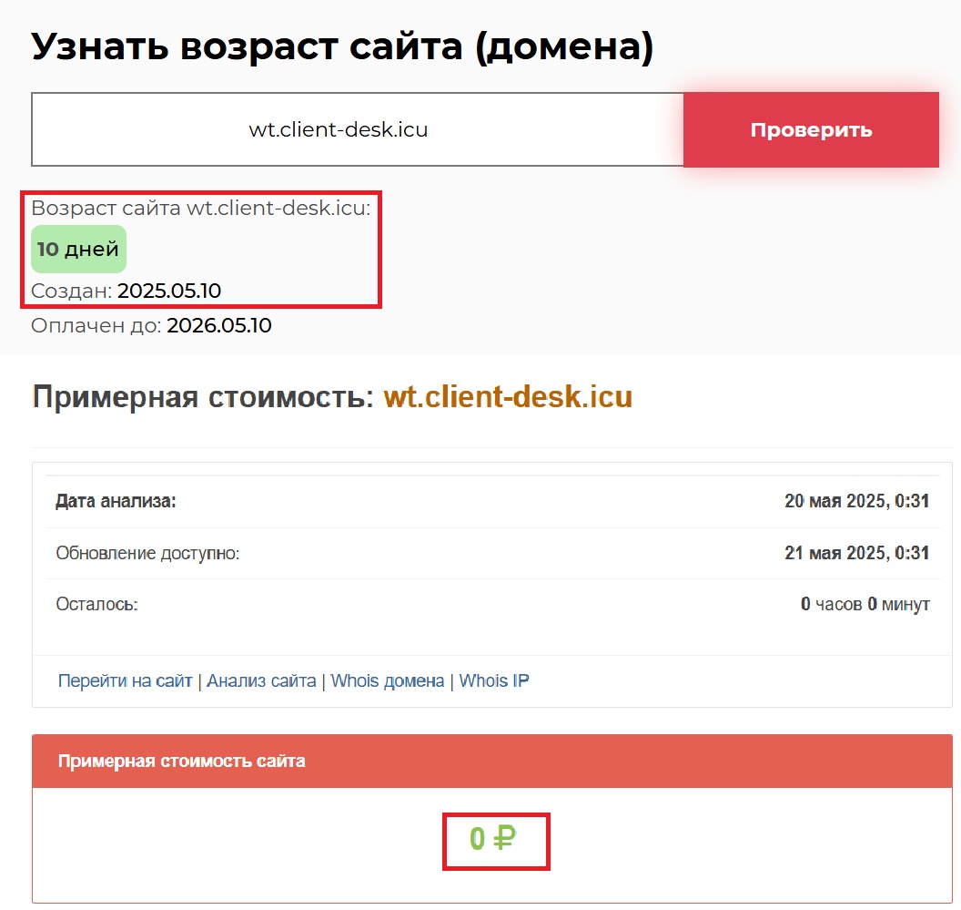 Но давайте немного фактов. Мы провели проверку через открытые сервисы, и, честно говоря, результат получился… предсказуемый. Сайт wt.client-desk.icu зарегистрирован недавно — всего 10 дней назад, конкретно — 10 мая 2025 года. Убедительная ли это дата для «международного брокера с многолетним опытом»? Вряд ли. А теперь внимание: стоимость домена — ноль рублей. Простите, как можно говорить о серьезных инвестициях, если даже в цифровой адрес проекта вложено меньше, чем в чашку кофе? Это вызывает уже не недоверие — это вызывает сарказм. Мрачный, как и все, что связано с этим сайтом.