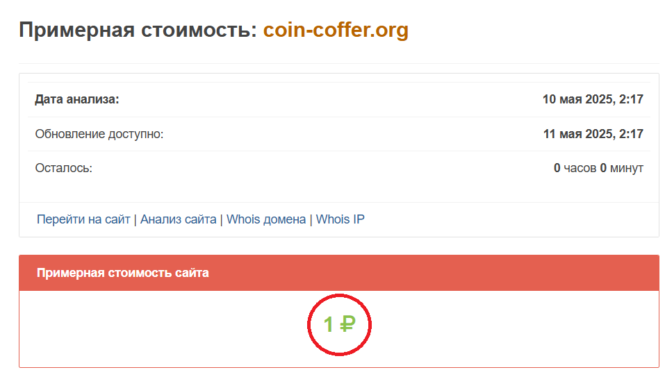 На мошенничество в Coin Coffer указывает несколько моментов. Сперва предлагаем обратить внимание на малый возраст домена (около 2 месяцев) и низкую примерную стоимость (1 рубль), что указывает на молодость площадки и использование жуликами самого банального и дешевого шаблона для оформления сайта.