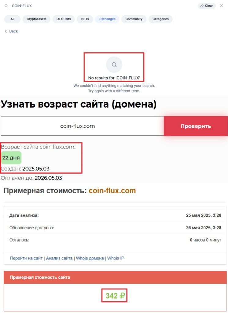 У названой конторы привлекательная обложка: перед инвесторами открывается вроде как стильный сайт с множеством полезных штучек и интуитивно понятным интерфейсом. Однако стоит уделить чуть больше внимания проверке пространства, и вы тут же смените свое мнение. Как выясняется в ходе анализа, лжебиржа COIN-FLUX функционирует менее месяца. Ее домен был зарегистрирован 3 мая 2025 года.