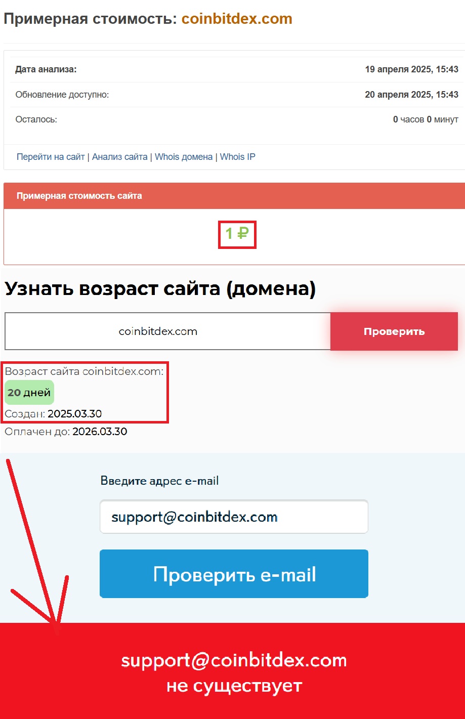 Мы не впервые видим подобную схему. Мошенники не тратятся на разработку с нуля — они берут заезженный шаблон, меняют цвета, шрифты, добавляют фальшивую почту и телефон, и вперед — в бой за доверие доверчивых пользователей. Кстати, о почте. Указанный ящик support@coinbitdex.com проверили — фейк. Телефон +1 (618) 362-2134 — не обслуживается. Адрес, указанный на сайте? Мы провели проверку — здание по этому адресу либо не существует, либо не имеет никакого отношения к CoinBitDex. Согласитесь, звучит уже тревожно.