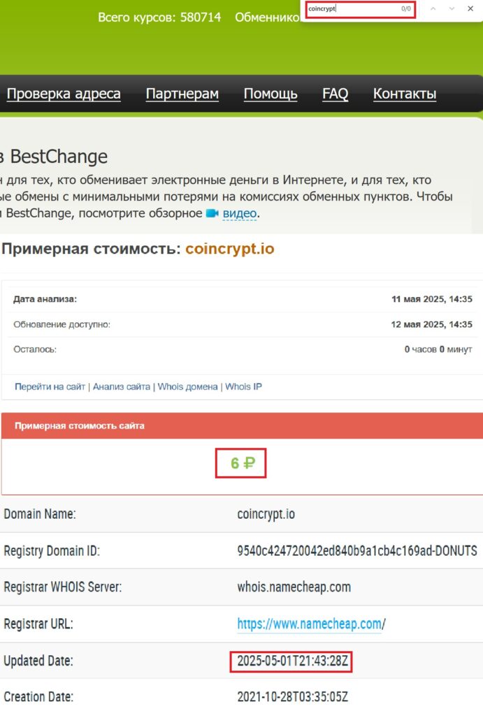При анализе ресурса становится понятно, что аферисты выбрали наиболее легкий путь и использовали максимально банальные решения. Вот, к примеру, можем обратить внимание на домен конторы. Он был зарегистрирован 28 октября 2021 года, но активничать на нем начали лишь 1 мая 2025 года. Получается, что обменник CoinCrypt функционирует всего несколько дней.