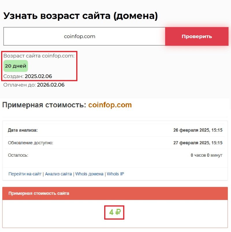 Проверка через сервис Whois показала, что возраст проекта всего несколько дней. Однако аферисты уверяют, что работают с 2015 года, пытаясь создать иллюзию солидной организации. В реальности Coinfop начала свою деятельность лишь 6 февраля 2025 года. Этот факт сам по себе должен насторожить, но есть и другие тревожные моменты. Например, стоимость сайта составляет всего четыре рубля. Можно ли всерьез воспринимать «международную финансовую компанию», которая даже не вложилась в собственную платформу? Вряд ли.