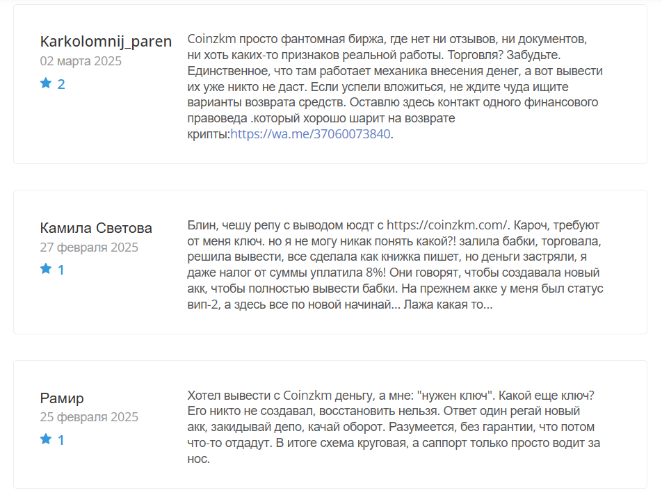 Даже несмотря на молодость проекта, в Интернете уже появилось немало отрицательных отзывов. Практически во всех из них пользователи упоминают о материальных потерях и называют Coinzkm типичным скамом.