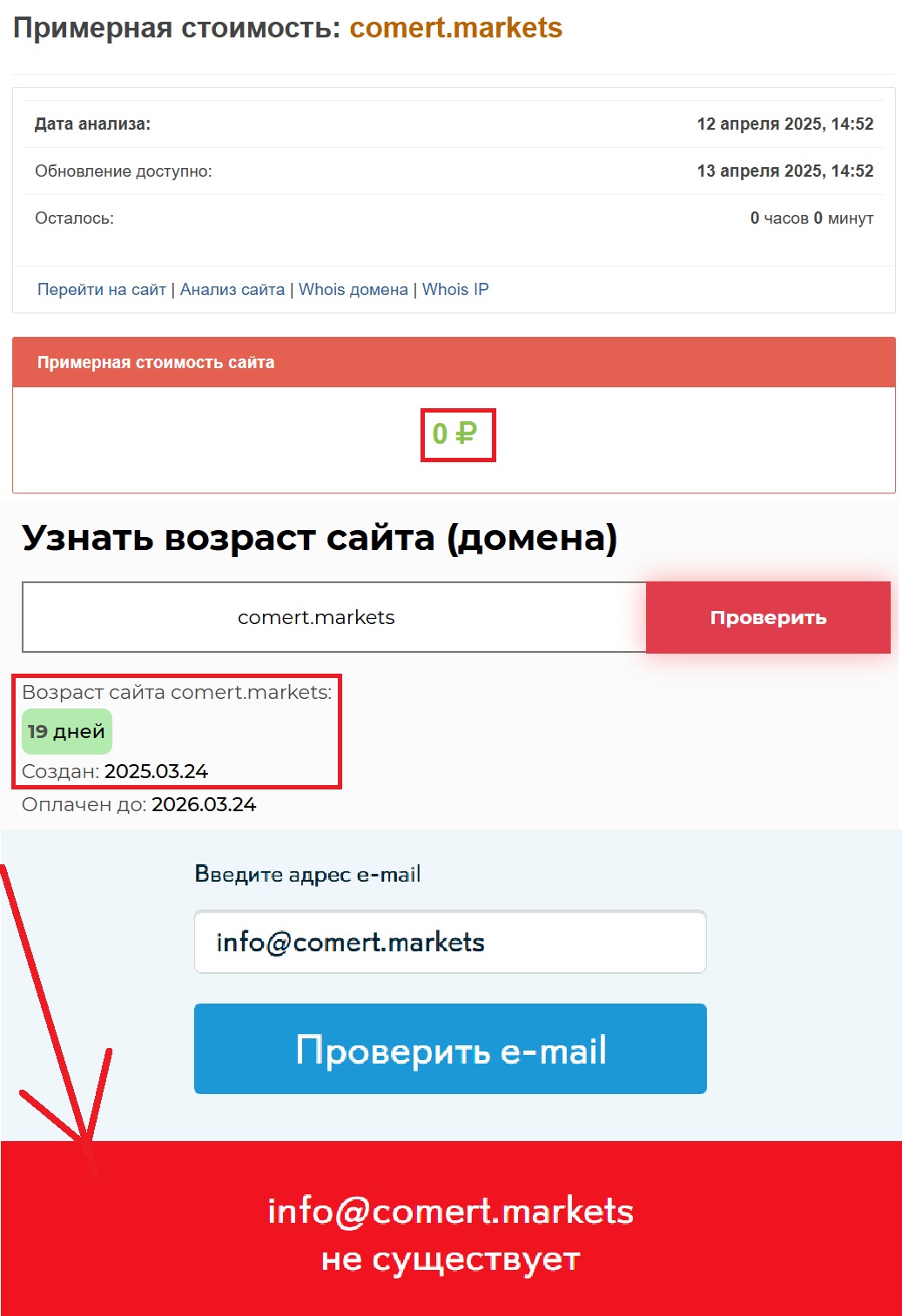 Мы, естественно, не ограничились беглым осмотром сайта. Решили покопать глубже, используя сторонние сервисы. И вот тут началось самое интересное. Выяснилось, что проекту всего 19 дней. Да, меньше месяца. А ведь на официальной странице говорится о каком-то «многолетнем опыте» и «команде профессионалов». Где они, эти профессионалы? Неизвестно. Из документов — ничего. Из лицензий — ноль. Из контактной информации — только электронная почта info@comert.markets, да и она оказалась поддельной. Написать можно, а вот ответа — увы, ждать бессмысленно.