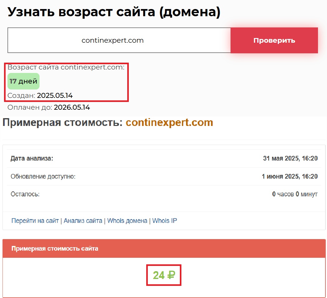 Самое интересное — срок жизни проекта. Вы когда-нибудь слышали про брокера, который работает чуть больше двух недель и при этом заявляет о многолетнем опыте? Мы тоже нет. А ведь именно так подает себя Contin. По данным сторонних сервисов, домен был зарегистрирован 14 мая 2025 года. А теперь — подумайте. Какая серьезная компания запускается так быстро и уже собирает инвестиции и якобы выплачивает «доход»? Мы таких не встречали. Потому что их просто не существует.