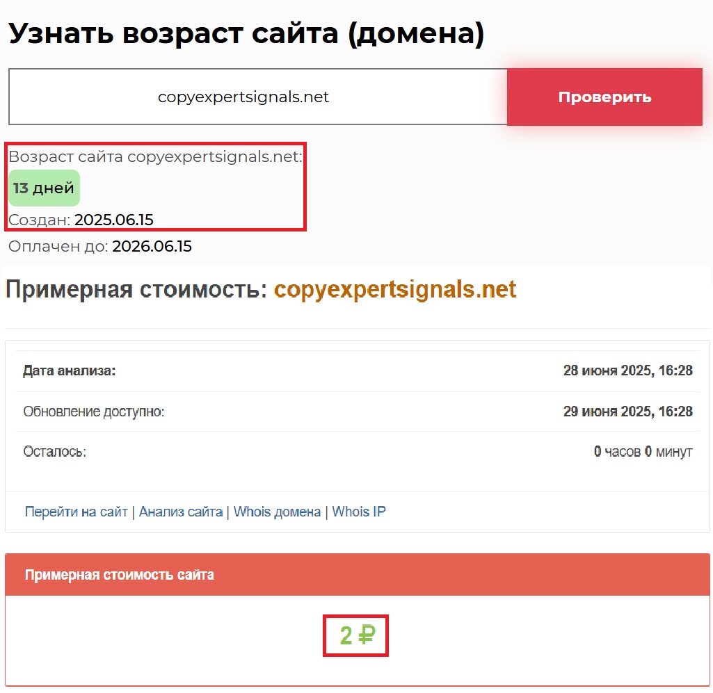 Мы провели проверку при помощи сторонних сервисов и получили достаточно любопытный результат. Доменное имя проекта было зарегистрировано 13 дней назад, то есть 15 июня 2025 года. Именно тогда и началась активная эксплуатация ресурса в его текущем виде. То есть весь многолетний «опыт» — не более чем декорация, иллюзия для доверчивых пользователей.