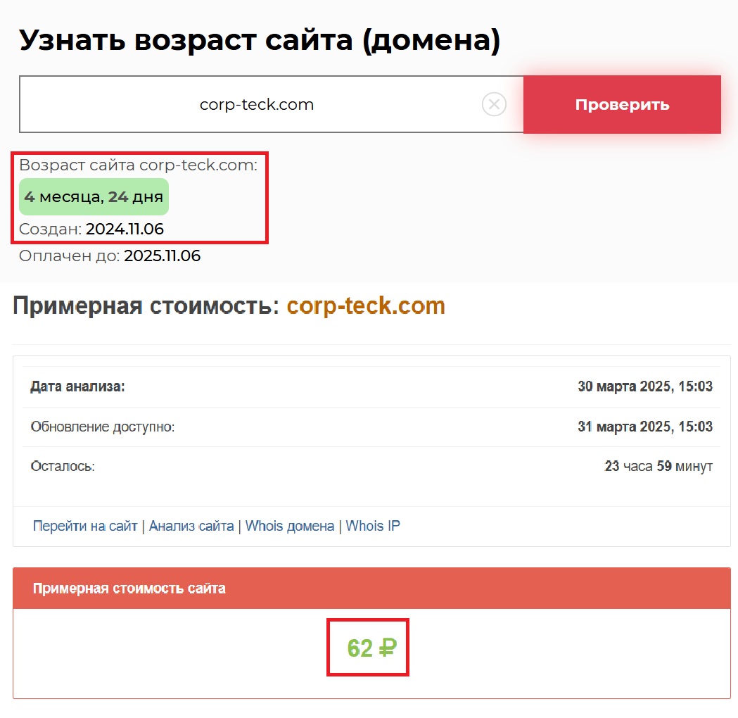 Если проверить этот сайт сторонними сервисами, то становится очевидно, что тут и не пахнет серьезной компанией. Стоимость ресурса — 62 рубля. За такие деньги нормальные брокеры не работают, а вот мошенникам хватает, ведь им не нужна ни поддержка клиентов, ни качественная платформа. Возраст проекта — всего 4 месяца и 24 дня. Проще говоря, вчера его запустили, а завтра он может исчезнуть.