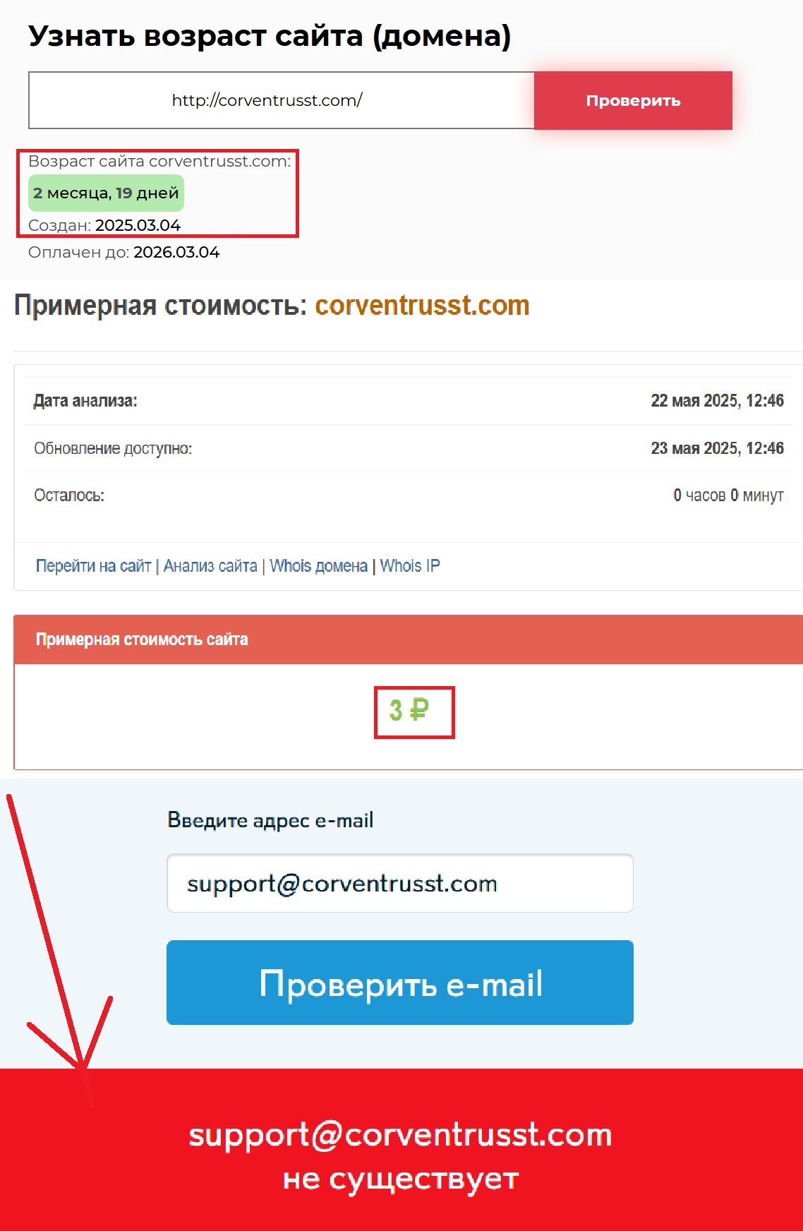 Контактная информация на сайте, кстати, тоже вызывает улыбку. Адрес электронной почты — support@corventrust.com — существует только на страницах самого сайта. Ответов оттуда нет.