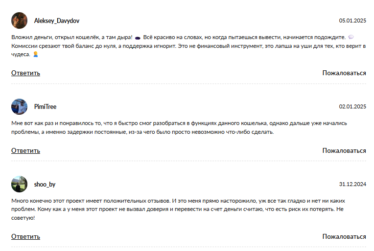 На неподконтрольных мошенникам площадках люди сообщают о проблемах при использовании упомянутого проекта. Пользователи пишут о невозможности вывести деньги, рассказывают об отсутствии поддержки и прозрачности. Также на форумах встречаются комментарии, в которых юзеры жалуются на потерю больших сумм впоследствии использования Cropty.