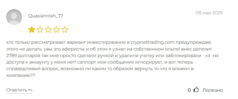 Также отметим тот факт, что собственники Crypnet Trading утверждают, что не взимают сервисных сборов за вывод средств. Однако комиссии, по их словам, могут взиматься платежными системами. Данный нюанс может быть попыткой отвлечь внимание жертв от возможных скрытых комиссий или задержек при выводе денег. Это также характерно для мошеннических схем.