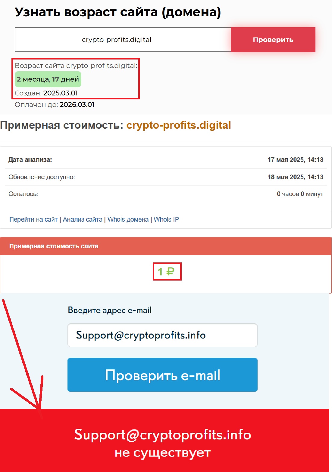 Более того, внимание: стоимость сайта, по оценке сторонних сервисов, равна… одному рублю. Звучит смешно? А ведь именно туда вы потенциально можете отправить свои деньги. Подумайте, прежде чем нажимать на кнопку «пополнить счет». Вы уверены, что хотите доверить свои сбережения ресурсу, который стоит дешевле бутылки воды? И знаете, что еще? На сайте вы не найдете никакой контактной информации, которая действительно работала бы. Ни нормального телефона, ни живого чата, ни даже вменяемой почты. Почтовый ящик Support@cryptoprofits.info полностью фейковый. Если возникнут проблемы — а они обязательно возникнут — вы останетесь с ними один на один. И помочь вам будет некому.