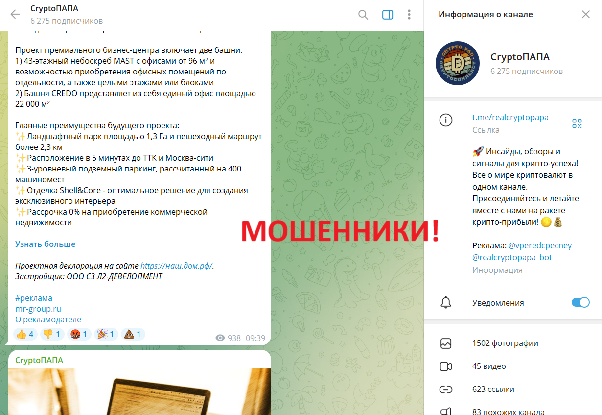 Канал в Телеграм CryptoПАПА представляют как источник эксклюзивной информации, торговых сигналов и рекомендаций по вложениям в крипту. В описании сообщества и его рекламе есть немало заманчивых слов об «уникальных стратегиях», «гарантированном доходе», «безопасных инвестициях без рисков». Звучит такое, естественно, очень и очень интересно. Однако вестись на подобное не стоит.