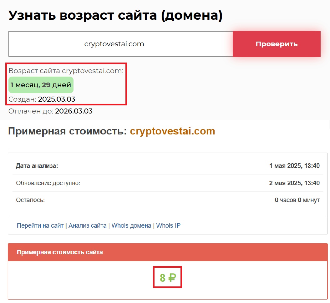 Мы, конечно, провели собственную проверку. Оказалось, что домен был зарегистрирован всего 1 месяц и 29 дней назад, то есть 3 марта 2025 года. Что это значит? Все просто: о многолетнем опыте вам врали. Ну а стоимость в восемь рублей, о которой тоже стоит упомянуть, говорит о многом. Настоящие финансовые организации вряд ли довольствуются такими «вложениями» в собственный ресурс.