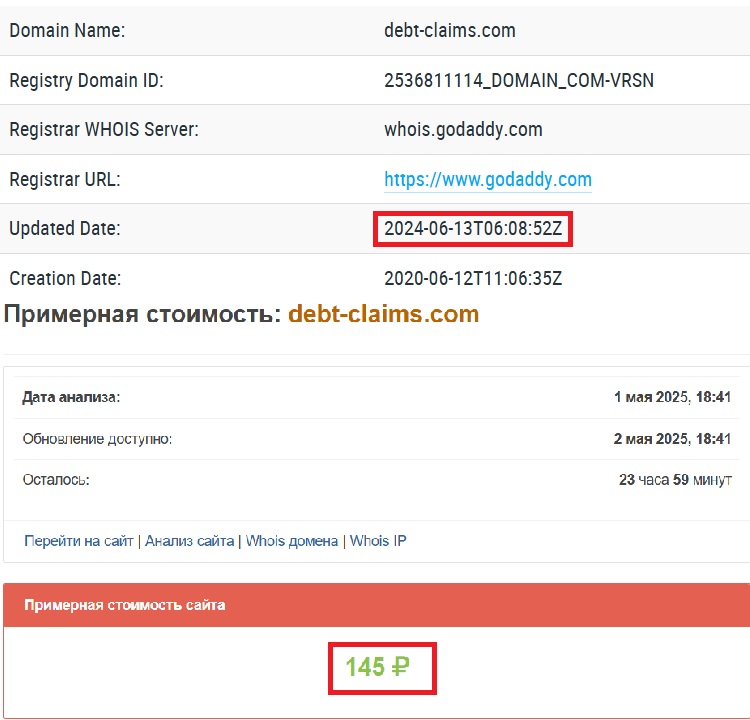По итогам анализа домена Debt-Claims Solicitors было установлено, что он был создан в 2020 году. Однако 13 июня 2024 года сайт получил обновление. С этой даты на нем началась активная работа. Казалось бы: что здесь не так? Дело в том, что это классический прием многих аферистов. Они покупают площадки «с историей» дабы вводить пользователей в заблуждение.
