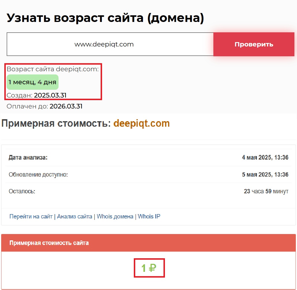 И теперь о важном. Официальной лицензии у проекта нет. Никакой регистрации, ни одного документа, подтверждающего законность его деятельности. Все, что заявлено — просто слова. В лучшем случае — фантазии, в худшем — намеренное введение в заблуждение. А между тем, домен зарегистрирован совсем недавно: 31 марта 2025 года. То есть площадке всего один месяц. Это даже не смешно. Серьезная компания за такое время не успеет даже встать на ноги, а здесь вам уже предлагают доверить свои сбережения. Цена сайта? Один рубль. Это явно не стоимость серьезной финансовой платформой.