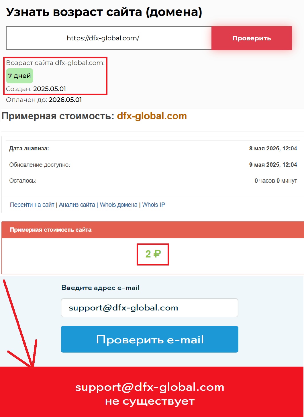 Более того, когда мы проверили возраст домена через сторонние ресурсы, выяснилась пикантная деталь. Несмотря на заявления о «многолетнем опыте», сайт появился в сети совсем недавно — всего-то 1 мая 2025 года. Прошло семь дней, а нам уже рассказывают о «десятках успешных кейсов» и «годы работы с крупными фондами». Несостыковочка, как говорится.