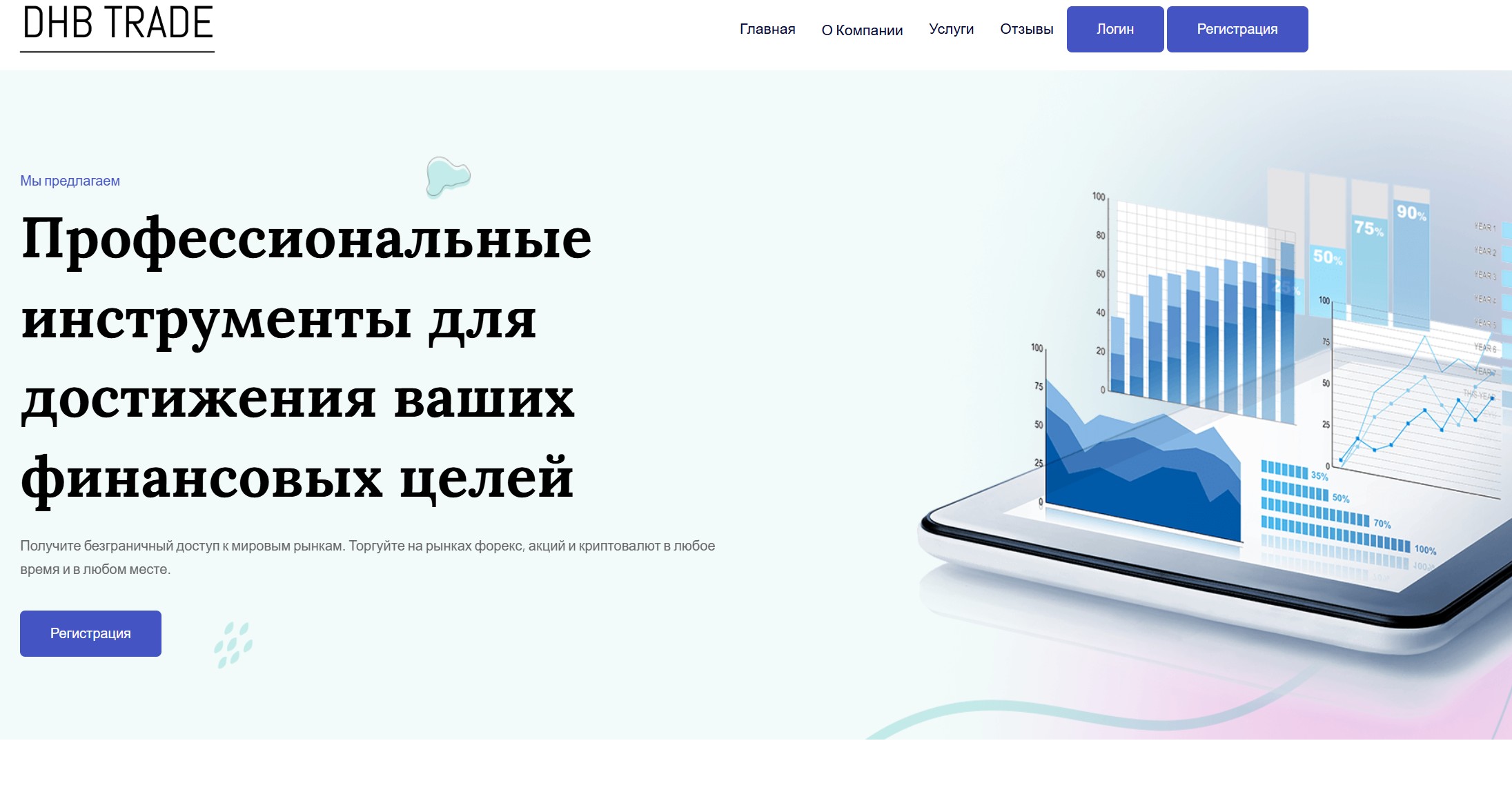 Начнем с самого простого — с официального сайта dhbtradeltd.com. Первый же взгляд говорит о многом. Перед нами типичный дешевый шаблон, каких в сети тысячи. Немного изменили название, перекрасили фон — вот вам и «уникальный» сервис. Оригинальностью тут и не пахнет. Поисковики, понятно дело, такую пустышку в топ никогда не выведут. Поэтому мошенники действуют иначе: засыпают соцсети сообщениями, обещающими легкий заработок. Только зарегистрируйтесь, только сделайте вклад…