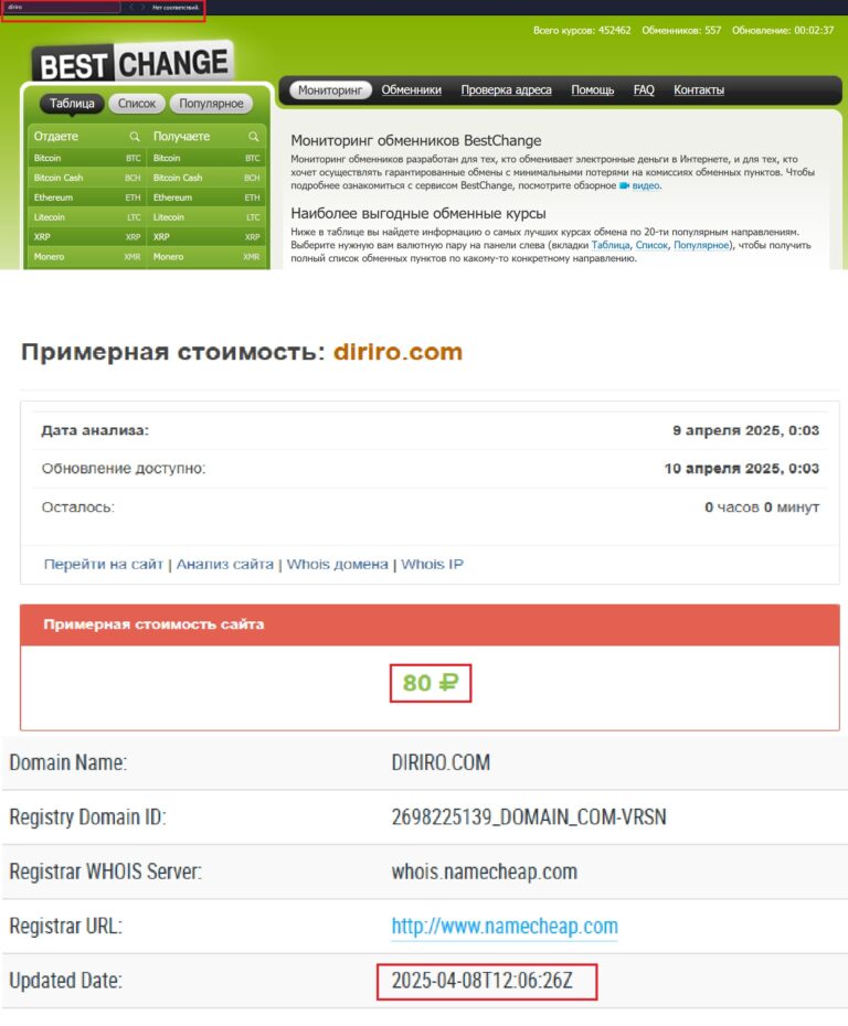 В ходе проверки обменного пункта было также выяснено, что сайт, на котором он располагается, существует несколько лет. Напомним то, что жулики нередко покупают площадки «с историей». Такой лайфхак порой помогает им вводить в оман более осторожных юзеров и лучше продвигать свои творения в поисковых системах. Поэтому видя в результатах возраст в парочку лет, знайте, что не всегда это является подтверждением длительного функционирования сервиса. Также отметим, что обменник Diriro отсутствует в списках авторитетных мониторингов, на которых обычно публикуются качественные и надежные для работы площадки.