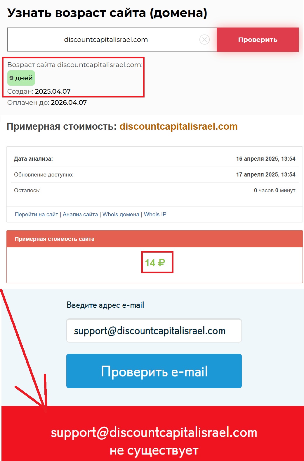 Кто-то может сказать: «Ну, может, проект давно работает?» Мы проверили: сайт работает всего 9 дней — он запущен 7 апреля 2025 года. То есть его просто выставили в нужный момент и начали активно продвигать. Все для того, чтобы внушить доверие. И, что особенно забавно — стоимость ресурса составляет 14 рублей. А вы все еще верите, что кто-то на полном серьезе создает профессиональную брокерскую платформу за такие копейки?