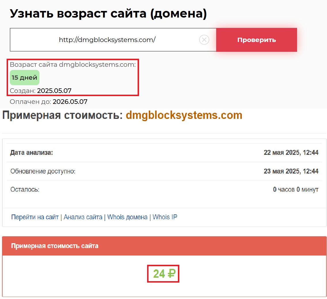 Но давайте посмотрим на еще один момент, который почему-то часто упускают новички — возраст проекта. Если верить тому, что нам обещают, DMG Block Systems якобы работает уже много лет. По факту же — домен зарегистрирован 7 мая 2025 года, а значит проекту на момент написания этих строк — чуть больше двух недель. Смешно, правда? Многолетний опыт за 15 дней. Да и стоимость домена — 24 рубля. Мы не хотим быть циничными, но это уже даже не попытка притвориться серьезной компанией — это просто игра на доверии. А точнее — на его отсутствии у клиента.